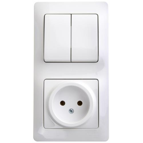 Блок комбинированный Glossa (в сборе, цвет белый) предназначен для сетей до 250 В, состоит из розетки на 16 А и 2-клавишного выключателя на 10 А.
