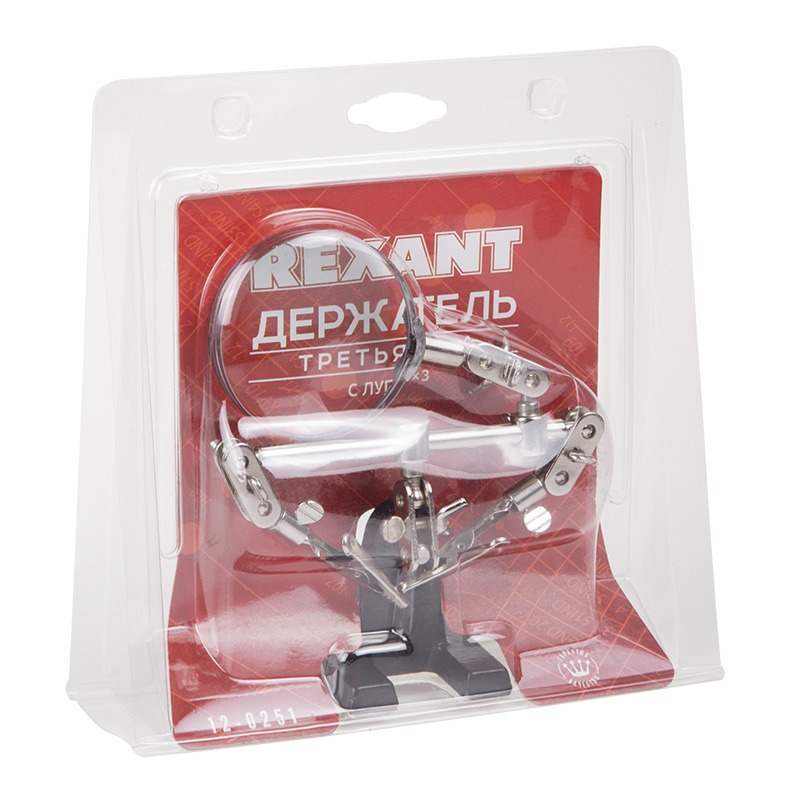 Держатель «третья рука» с лупой х3 REXANT служит, главным образом, при проведении паяльно-сборочных работ в электронике, ювелирном деле, сборке и ремонте для зажима мелких деталей в любом нужном положении, когда не хватает двух рук.