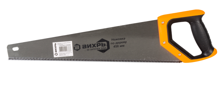 Ножовка ВИХРЬ 450 мм 3D заточка - это ручной инструмент для пиления древесины и других материалов. Длина ножовки 450 мм, шаг зуба 7-8 TPI. Ножовка изготовлена из углеродистой стали с твердостью закаленного зуба 46–52 HRС. Зубья имеют трехгранную (3D) заточку. Эта технология позволяет значительно увеличить скорость резки и уменьшить нагрузку на руки.