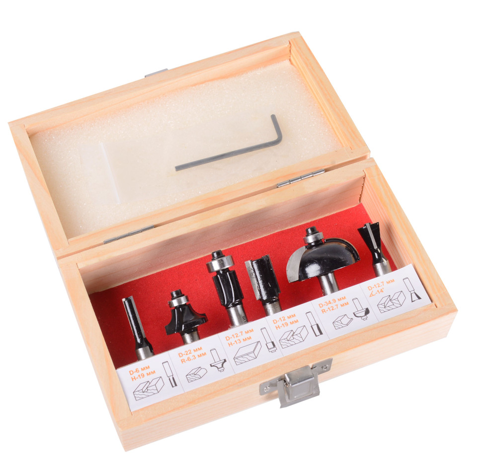 Набор фрез по дереву Вихрь 6шт с хвостовиком 8мм в кейсе для работы с фрезерными станками и ручными фрезерами.