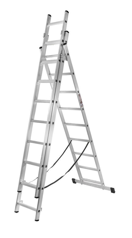 Складная алюминиевая трехсекционная лестница ВИХРЬ ЛА 3х9 на 9 ступеней при необходимости может использоваться как стремянка, стремянка с выдвижной третьей секцией, как приставная выдвижная лестница, а также третья секция съемная и может использоваться как отдельная лестница.