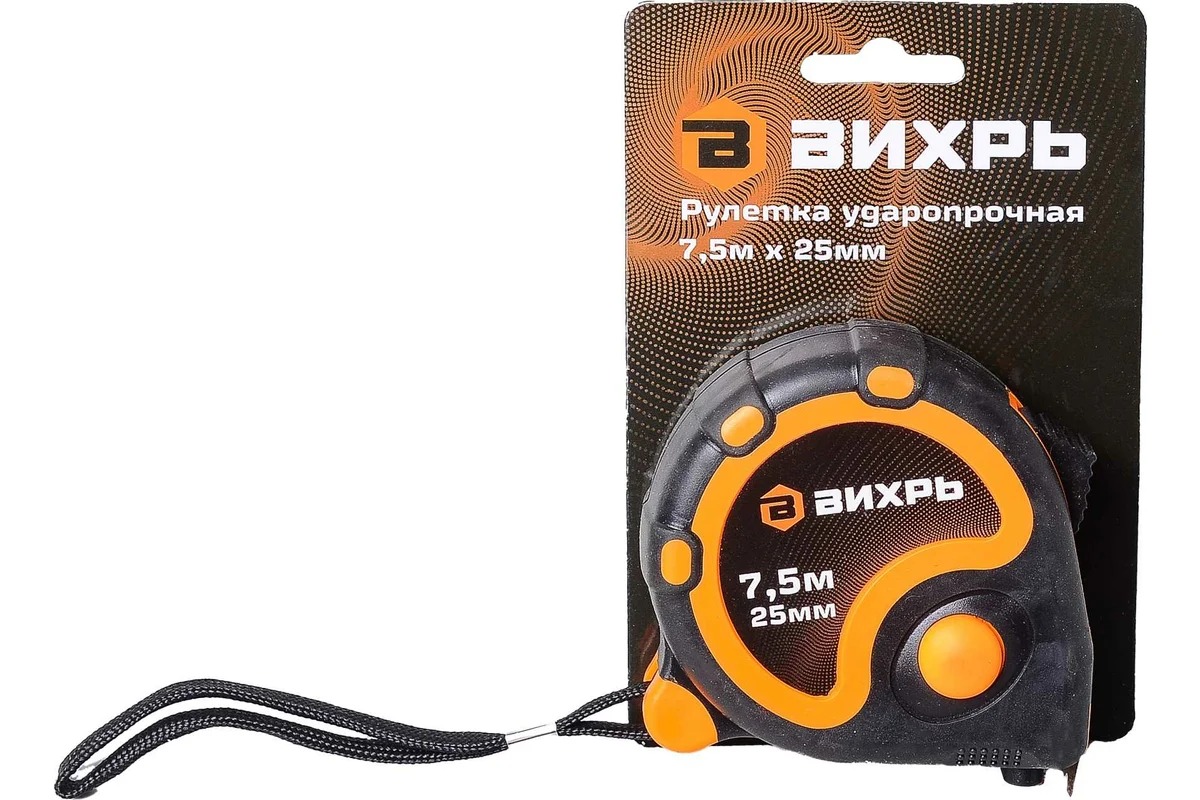 Рулетка измерительная ВИХРЬ 7,5мх25мм изготовлена из ударопрочного пластика с прорезиненным покрытием, защищающим ее от повреждений. Измерительная лента из высококачественной стали с нейлоновым покрытием обеспечит долговечность и стойкость к истиранию шкалы. Есть фиксатор механизма сматывания полотна. Также предусмотрен ремешок для переноски на руке. Длина ленты 7,5 метров, ширина 25 мм.