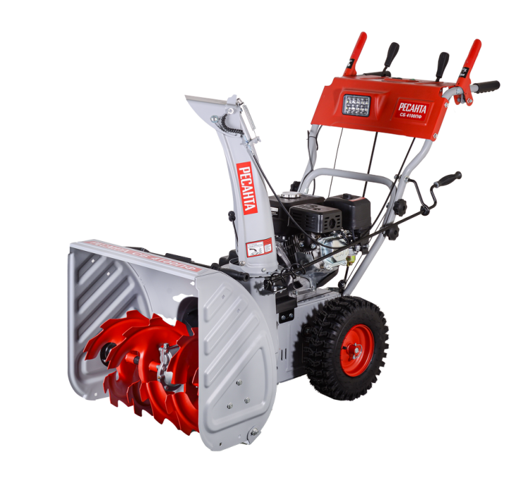 Двигатель имеет верхнее расположение клапанов, что обеспечивает его безотказную работу при низких температурах. Шнек крепится при помощи штифтов. В случае наличия постороннего предмета на пути срезаются шплинты. Благодаря этому, удается избежать серьезных неисправностей. Шплинты считаются расходным материалом и легко меняются. Так как Ресанта СБ4100ПФ – это самоходная техника, использовать ее могут люди с любой физической подготовкой. Наличие фары позволяет проводить работы в темное время суток.