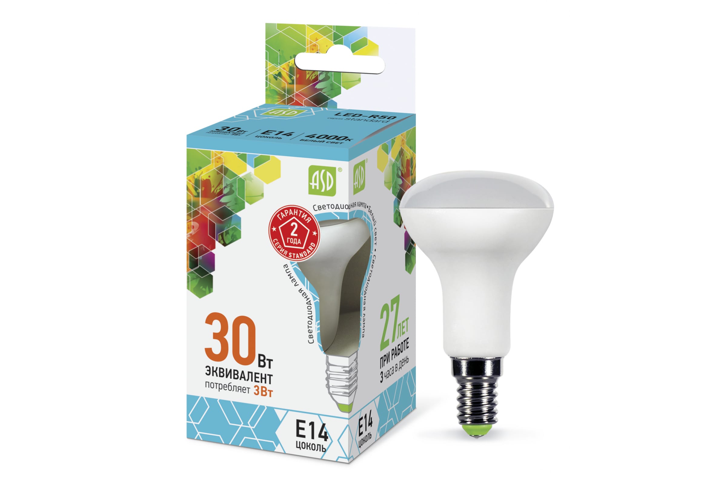 Рефлекторные светодиодные лампы ASD мощностью 3 Вт с цоколем E14 используют в разных типах светильников, в т.ч. в потолочных и настольных лампах. Но чаще всего они встречаются в спотах – специальных светильниках для точечного освещения. Рефлекторы, в отличие от лампочек груш или шариков, сужают световой поток, поэтому относятся к лампам прожекторного типа. Это отличный вариант для магазинов, торговых центров и салонов красоты, а также уличного акцентного освещения у фонтанов, памятников и других объектов.Корпус выполнен из прочного безопасного материала, а на боковых сторонах есть ребра, которые выполняют роль радиатора. Лампы рефлекторы 4000 К обладают высокой светоотдачей и обеспечивают мягкий свет, угол рассеивания которого — 120 градусов. Хотя яркость цветового пятна в центре освещаемой области составляет 100%, они не создают неприятного слепящего эффекта. Рабочее напряжение ламп рефлекторов ASD — 220В.