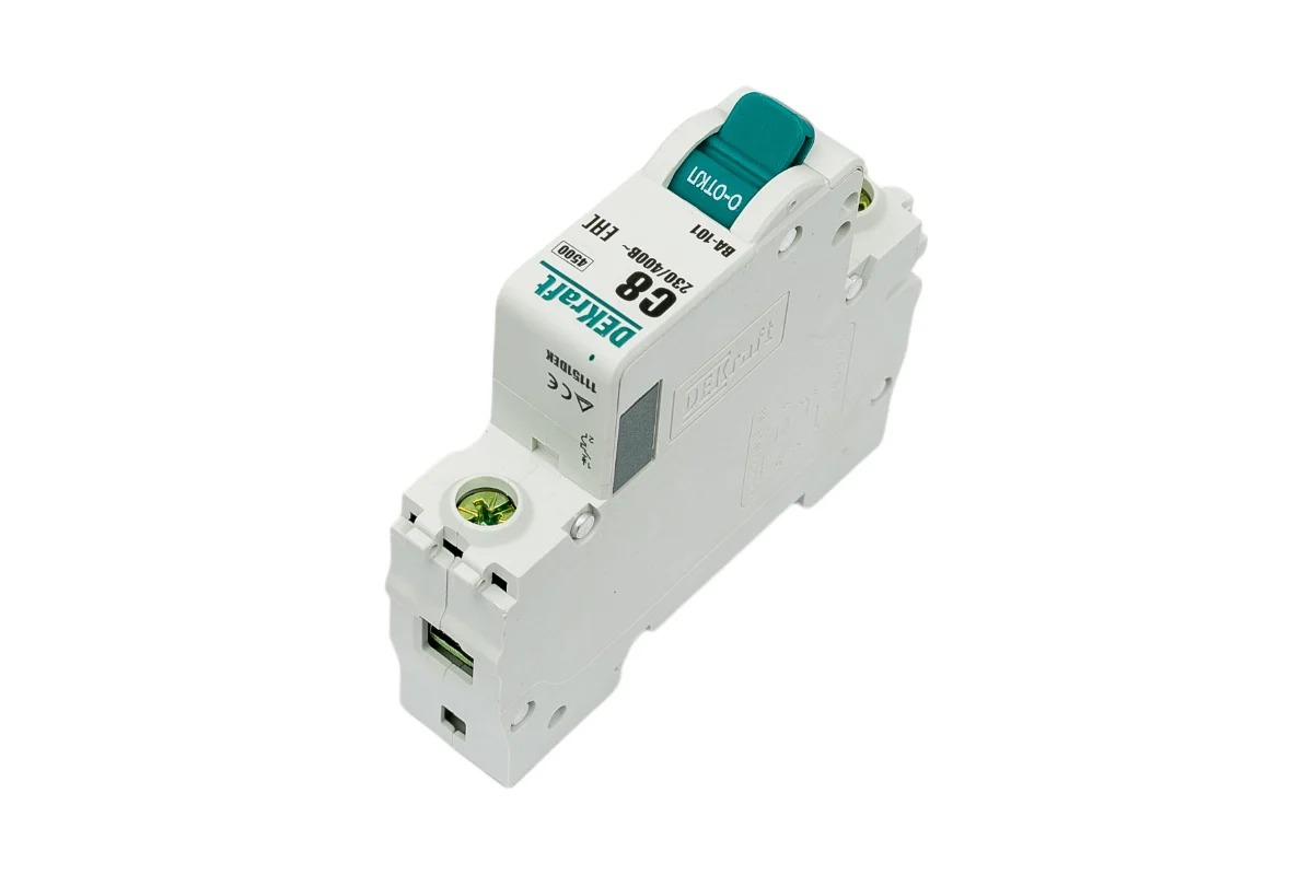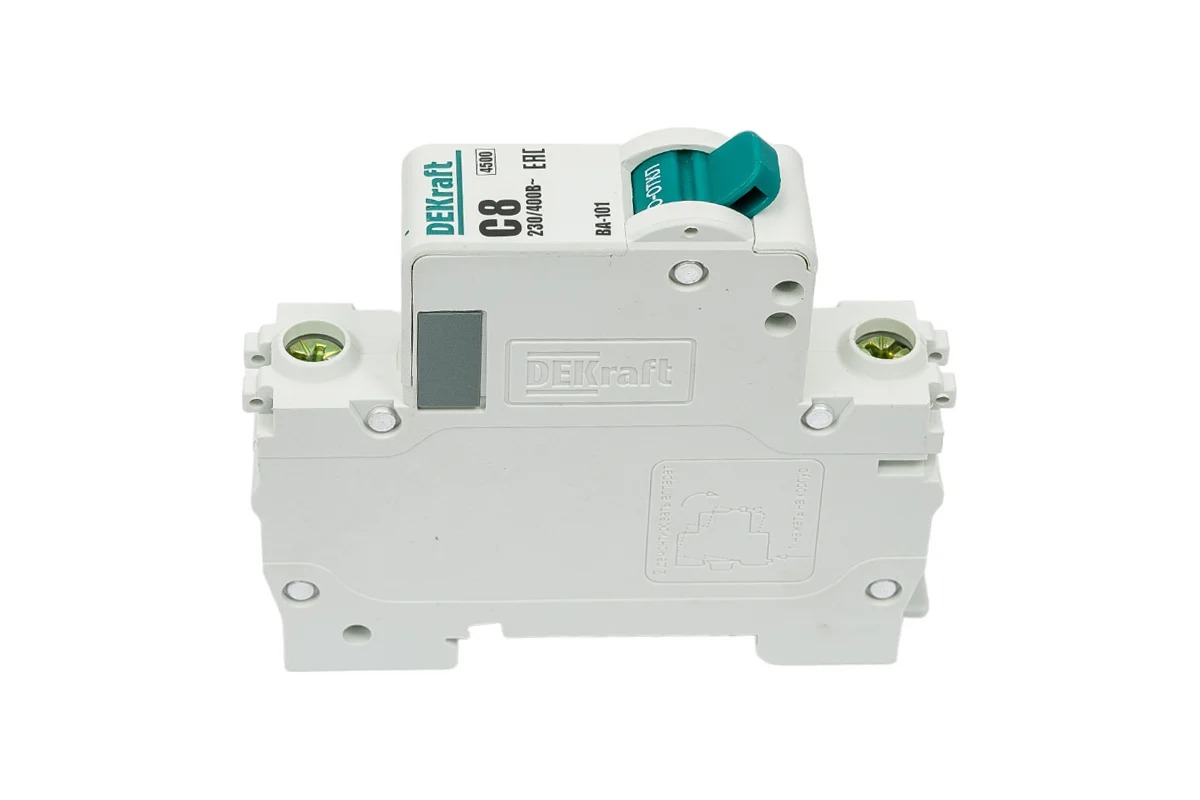 Автоматический выключатель серии ВА-101 DEKraft; 1P; номинальный ток 8 А; характеристика С; отключающая способность 4,5 кА. Новый механизм расцепления мгновенно разрывает цепь при возникновении аварии. 5 монолитных заклепок повышают прочность корпуса аппарата. Сплошная лицевая панель обеспечивает безопасность эксплуатации аппарата. Боковые каналы охлаждения повышают стабильность работы при высоких температурах окружающей среды. Полностью автоматизированный контроль качества производства.