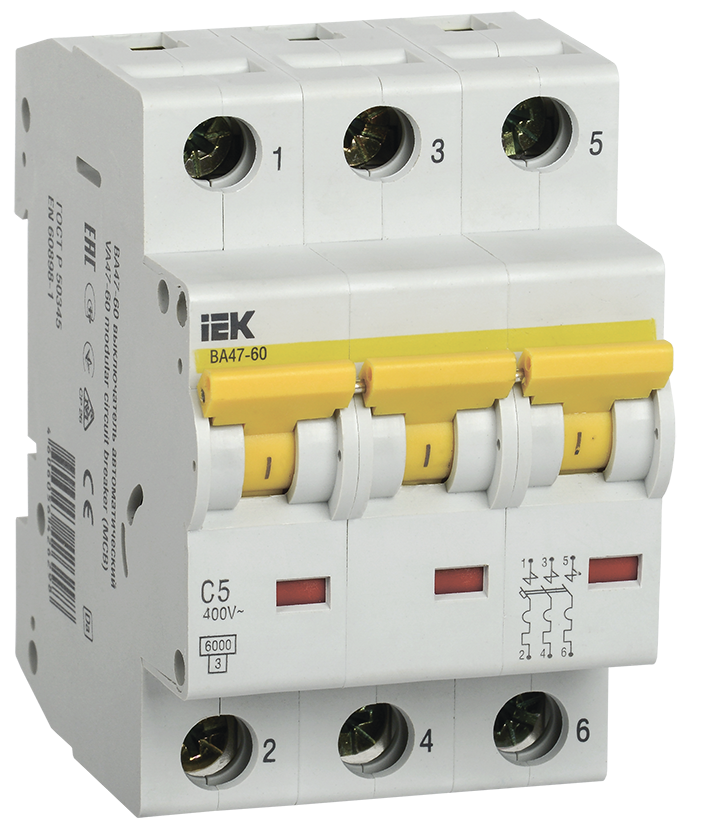 Автоматические выключатели ВА47-60 предназначены для автоматического отключения источника питания при появлении сверхтоков. Рекомендуются к применению в групповых щитках (квартирные и этажные), а также в учетно-распределительных щитах административных и жилых зданий. Два типа защиты от сверхтоков – тепловая и электромагнитная. Независимый индикатор положения контактов. Защелка на DIN-рейку с двойным фиксированным положением. Широкий диапазон рабочих температур от -40°С до +50°С. Широкая рукоятка для удобства включения/выключения автоматического выключателя. Насечки на контактных зажимах снижают тепловые потери и увеличивают механическую прочность соединения.