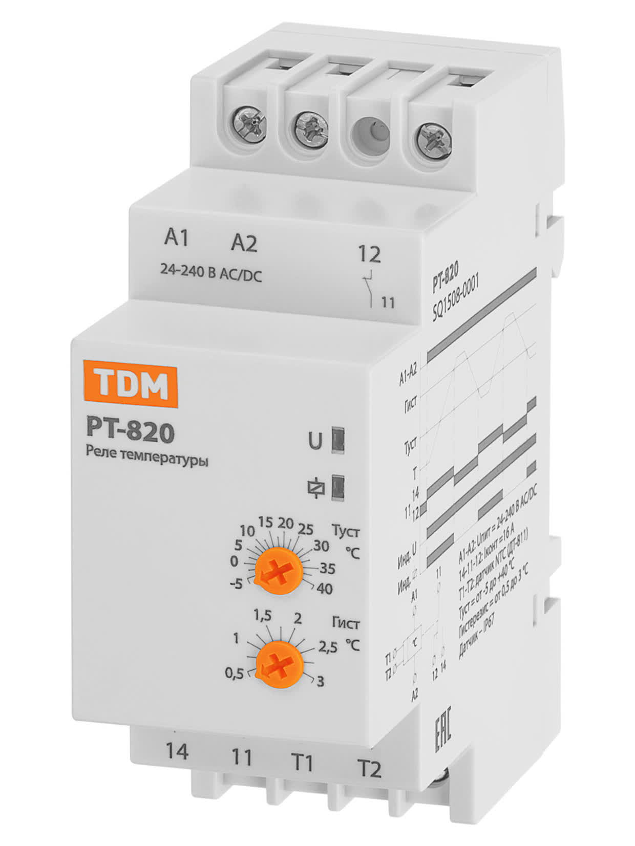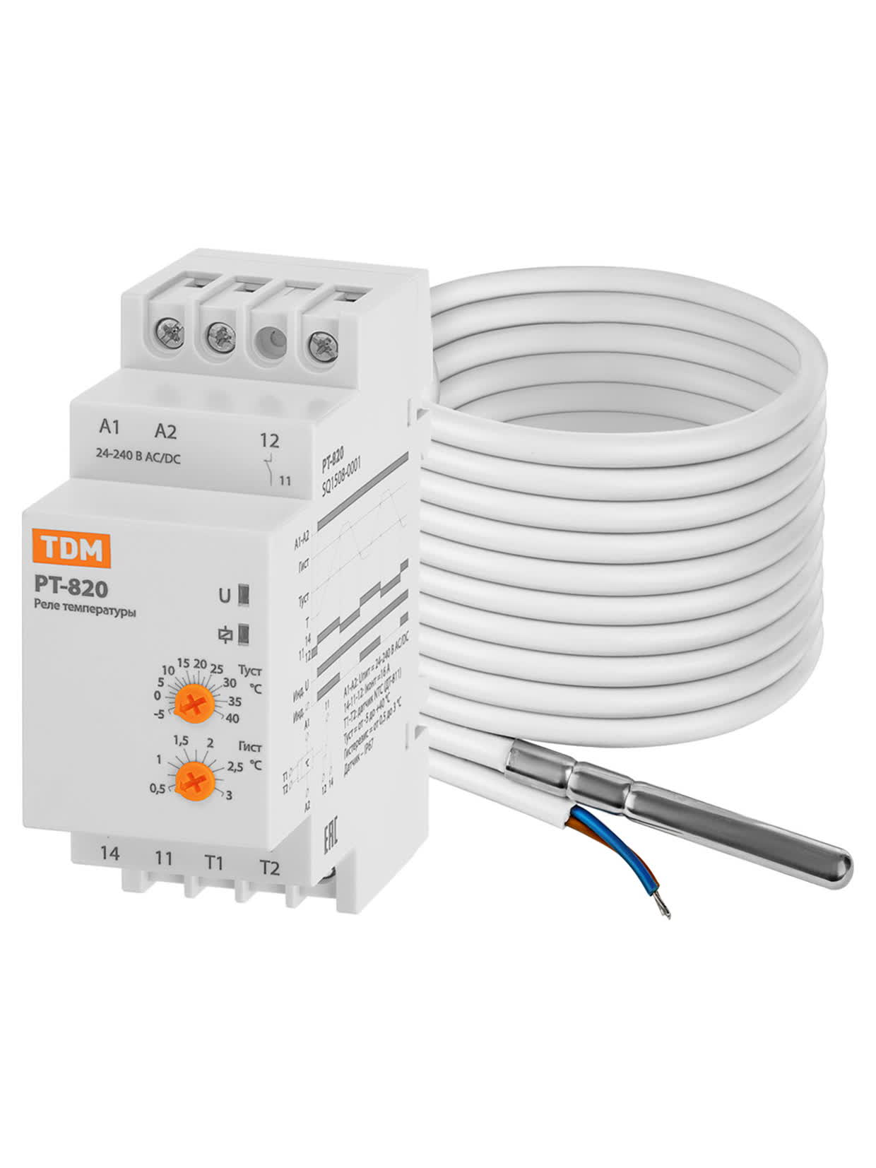 Реле температуры TDM РТ-820 -5+40С, 24-240В, АС/DC, с датчиком, IP67 SQ1508-0001 предназначено для контроля и поддержания заданного уровня температуры путем включения/выключения нагревательной/охлаждающей установки по сигналам выносного датчика температуры. Применяется для контроля заданного уровня температуры в жилых и общественных помещениях, электрощитовом оборудовании, овощехранилищах, холодильных установках, резервуарах с жидкостями, системах водяного отопления и др.