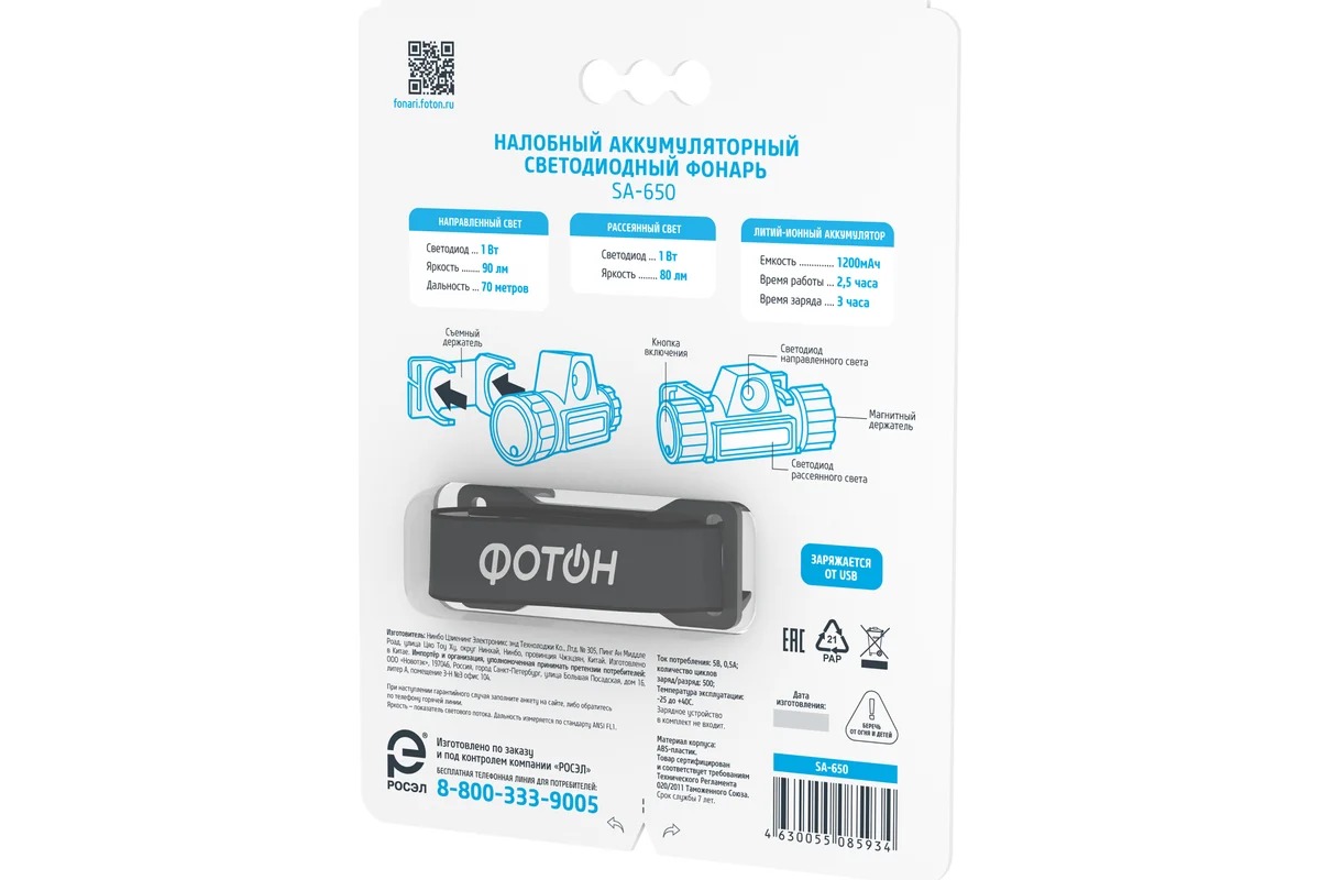 Фонарь светод. SА-650 1Вт налоб, аккум. "ФОТОН"